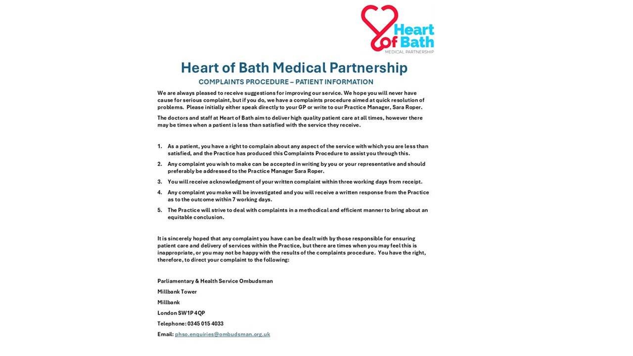 - In writing – letter or email (bswicb.heartofbath@nhs.net)